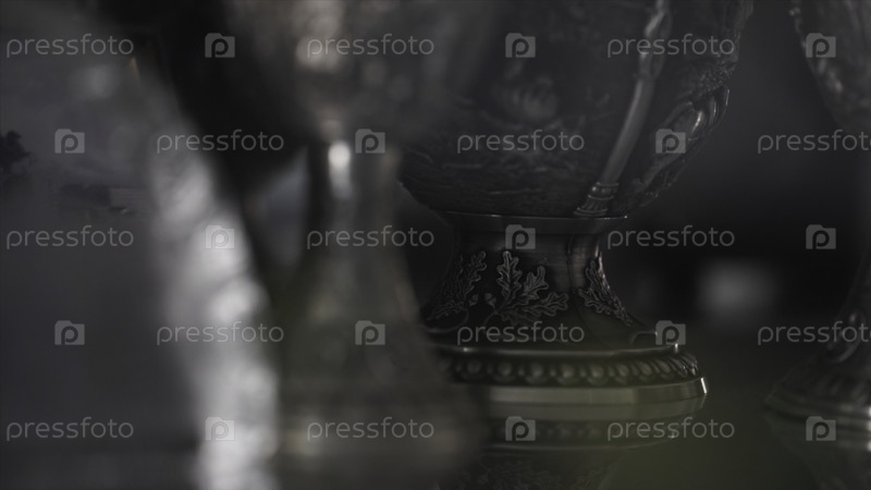 Винтажная ваза. металлический кувшин с арабскими ювелирными изделиями. металлическая винтажная ваза. винтажная ваза с оранжевым светом, распространяющимся изнутри на маленьком столе