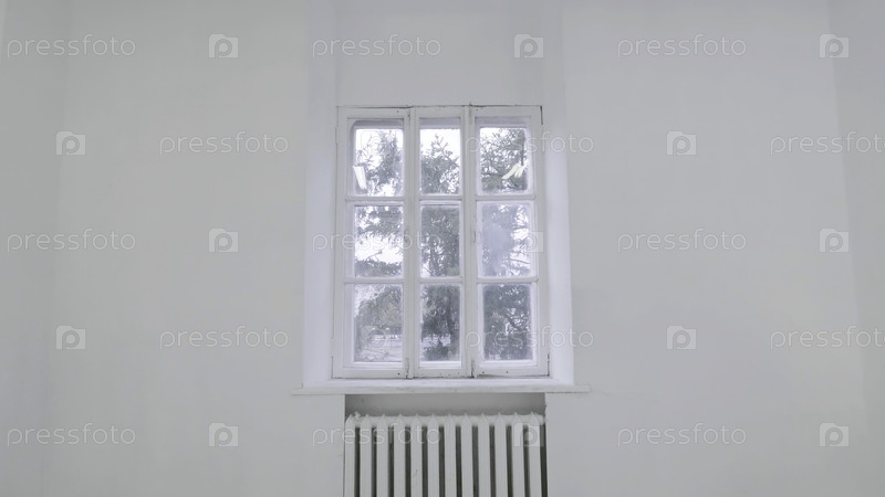 Белая стена с окном. Сдвижное движение или помещение камеры в пустую светло-белую комнату с окном. Дом Пустая комната Алюминиевое окно на стене