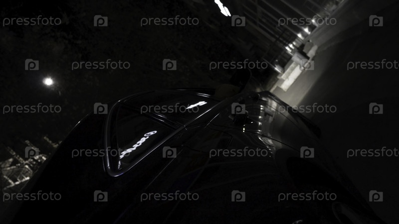 Закройте черную машину, припаркованную в городе ночью с различными светящимися огнями, концепция ночной жизни