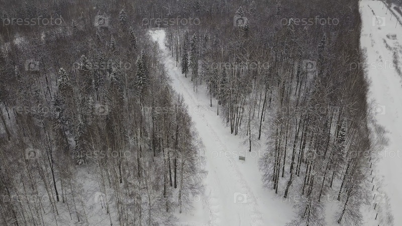Вид с воздуха снежных сосновых деревьев и слегка извилистых ручьев. Вид с воздуха зимнего леса, покрытого снегом. Замороженный зимний лес. Вид с воздуха заснеженного пейзажа