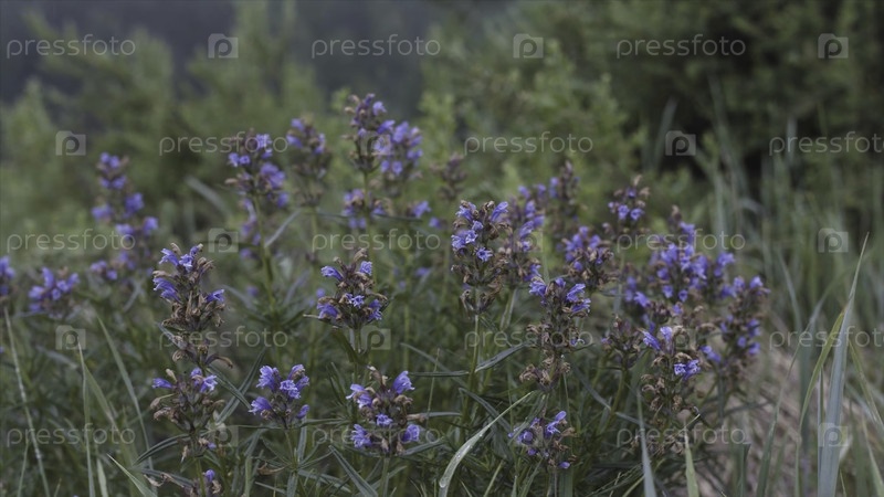 Закройте голубые цветы Dragonhead, растущие на поле. резервные кадры. Цветение лекарственного и нектарального растения Dracocephalum moldavica в дождливый летний день