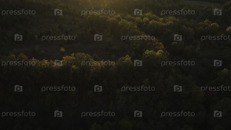 Панорамный вид на красивый оранжевый день заката огромных холмов и гор в нетронутом регионе Центральной Америки.Снимайте.Воздух зеленых холмов, покрытых лесом