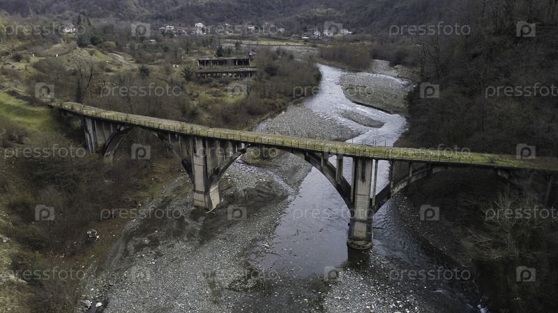 Лететь под разрушенным, сломанным бетонным мостом на фоне осеннего леса и реки с каменистым берегом.Стрелять.Воздух холодного горного ручья и деревянных холмов