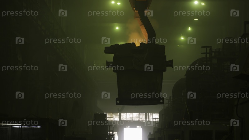Вид изнутри металлургической мастерской с решетчатым светом и большой ватой со расплавленной сталью внутри, концепция тяжелой промышленности