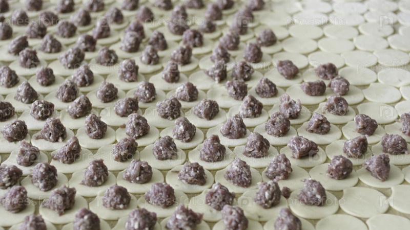 Закройте руки в перчатках для женщины, поместив силовые шары-маяки на плоские круги теста. Сцена. Моделирование пельмени на фабрике