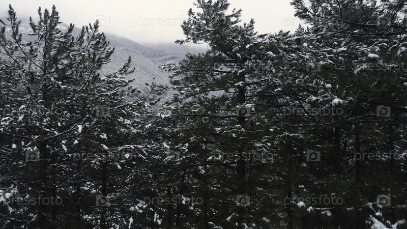 Зимний лес в горах с снегом на соснах, рождественский пейзаж