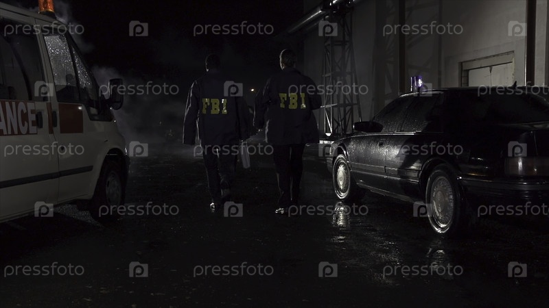 Три преступника работают на месте преступления ночью.Сцена.На место происшествия прибыли агенты ФБР и пошли к преступнику