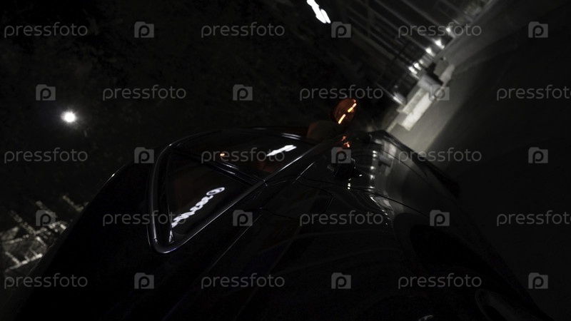 Черный автомобиль, движущийся по городу ночью с различными светящимися огнями, концепция ночной жизни