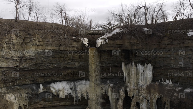 Воздух для небольшого желтого водного потока, спускающегося вблизи скал со грязным льдом на склонах скал. Сток. крутой склон высокого карьера с падающей грязной водой, естественный фон