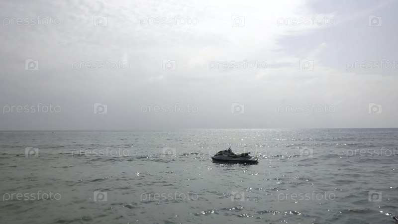 Плавание или джет-ски на воде в море и на фоне захода солнца. Детский лыжник Привязанный к морю на удивительном голубом фоне, пляж летнего стиля. Красивый пейзаж с джет-ки или водным велосипедом в море с волнами и солнцем