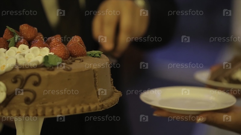 Руки жениха и невесты разрезают кусок свадебного торта. Режут свадебный торт. Люди режут и кладут торт на тарелку. Белый шоколадный пирог. Нож. Свадьба. Празднование