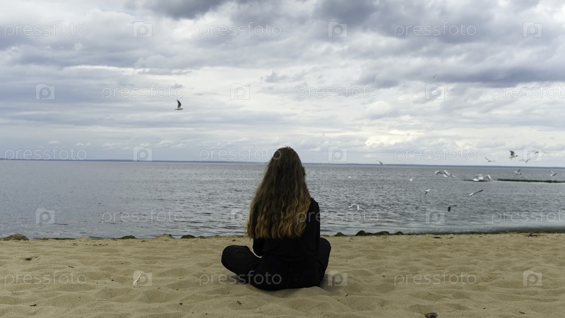 Молодая женщина сидит на берегу моря и смотрит в даль. Концепция. Задний вид молодой девушки с длинными кудрявыми красивыми волосами, глядящей на летающих чайков, драматический фон