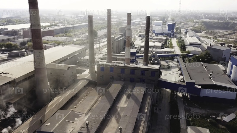 Вид с воздуха на сталелитейный завод. Резервные кадры. Летание над фабрикой с дымом, исходящим из труб, плохой экологией и концепцией загрязнения воздуха