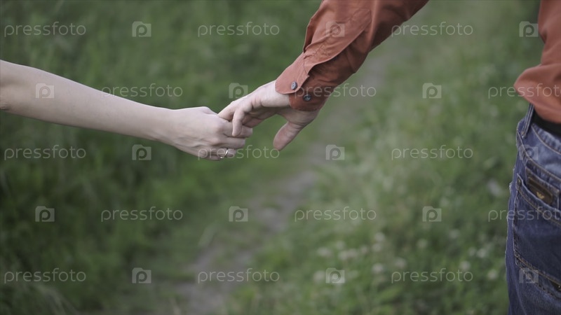 Влюбленная пара держится за руки в лесу.Клип.Разгляд сзади пары, гуляющей по лесу, держась за руки