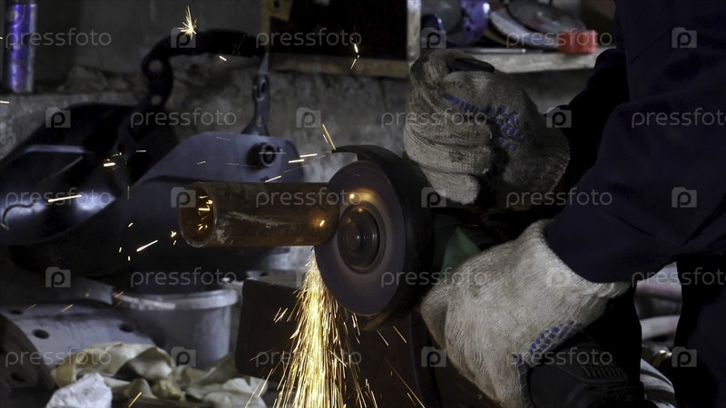 Рука мужчины отрезает кусочки водопроводной трубы с помощью угловой шлифовки.Обрезка превратилась в брызгу искр на строительной площадке.Искры при резке металлической угловой мельницы