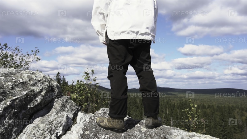 Турист стоит один в горном лесном ландшафте. Обратный вид скалы и взгляд на горизонт в солнечный день, на фоне леса