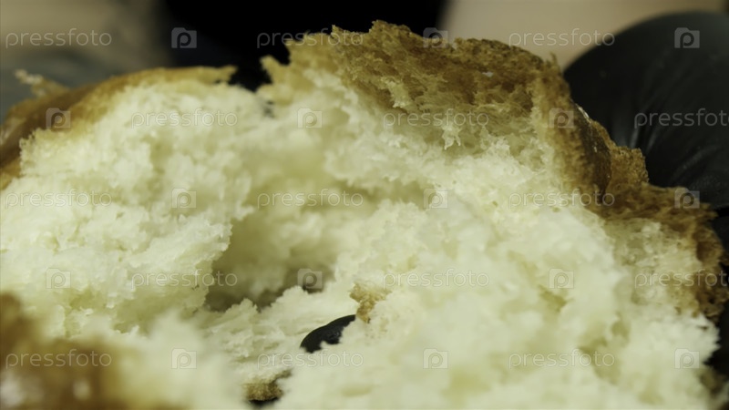 Рука мужчины рвет горячий хлеб, изолированный на черном фоне