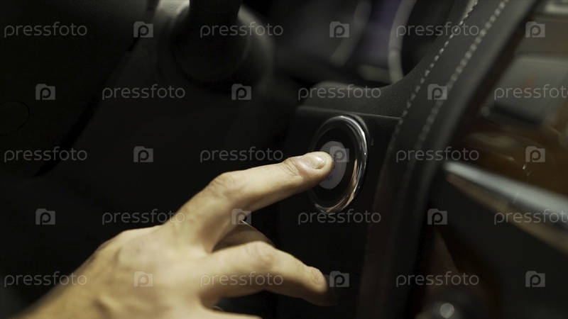 Человек нажимает кнопку запуска, останавливает двигатель