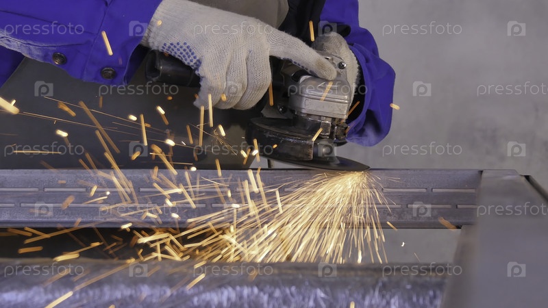 Электрическое шлифование колес на стальной конструкции на заводе низкоскоростной жалюзи.Рабочий работает с металлом или алюминием, используя специальное производственное оборудование.Портрет рабочего, измельчающего металлическую пластину. изготовление