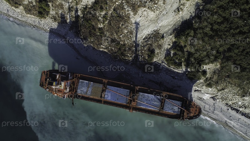 Вид из воздуха красного промышленного судна с людьми на борту, выполняющими работу моряка, пришвартованный у берега