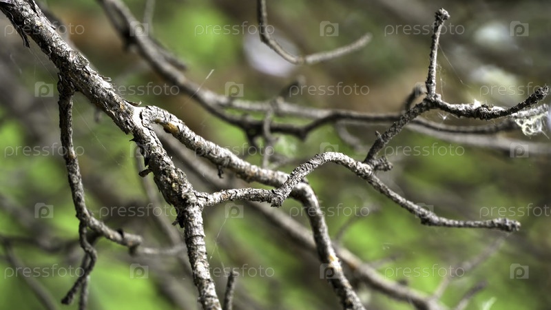 Закройте ветвь лысого дерева на размытом зеленом фоне, концепция осенней природы. резервные кадры. Деревянная ветка качается в ветре