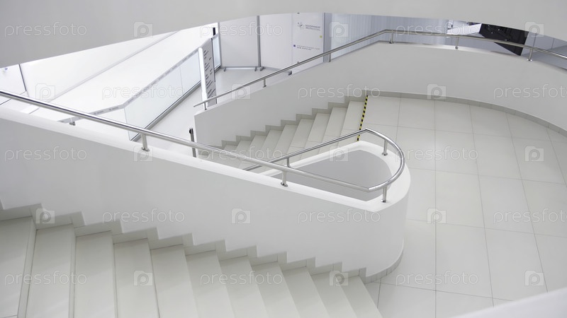 Пустой современный интерьер офисного здания. СМИ. Минималистский дизайн с красивыми белыми лестницами и стенами внутри нового офисного здания или торгового центра
