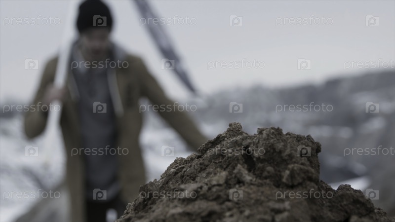 Человек с флагом на вершине горы вставляет флаг в землю, вид снизу вверх
