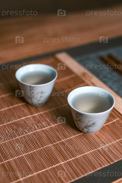 Спокойная обстановка с нежными чайниками на бамбуковом коврике, идеально подходит для отдыха и культурного восхищения