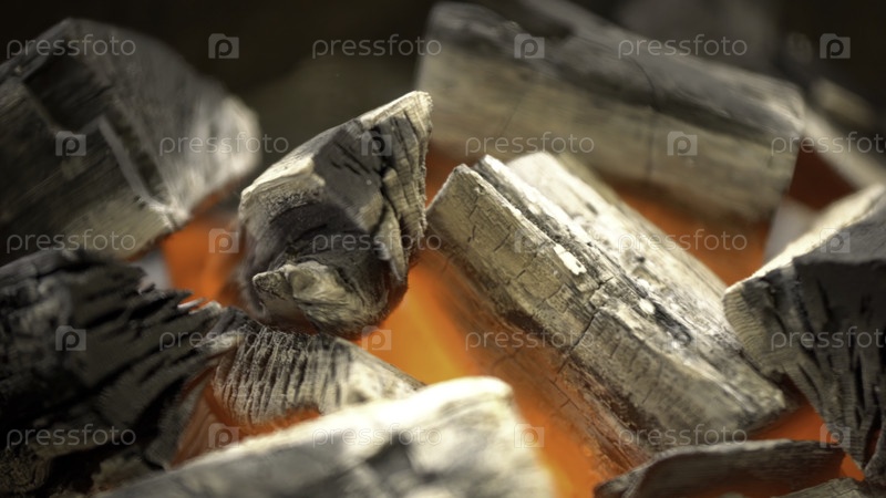 Блестящие угли закрываются, уголь и дрова горят на гриле