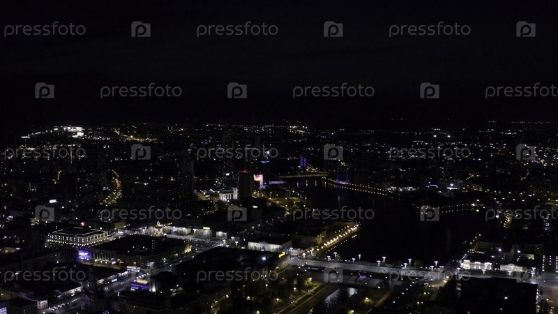 Панорама современного темного города ночью. Резервные кадры. Вид на красивый современный город с светящимися небоскребами в темную ночь. Прекрасный городской пейзаж ночью