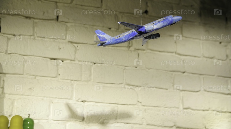 На фоне каменной стены на веревке висит игрушечный самолет, концепция выполнена вручную
