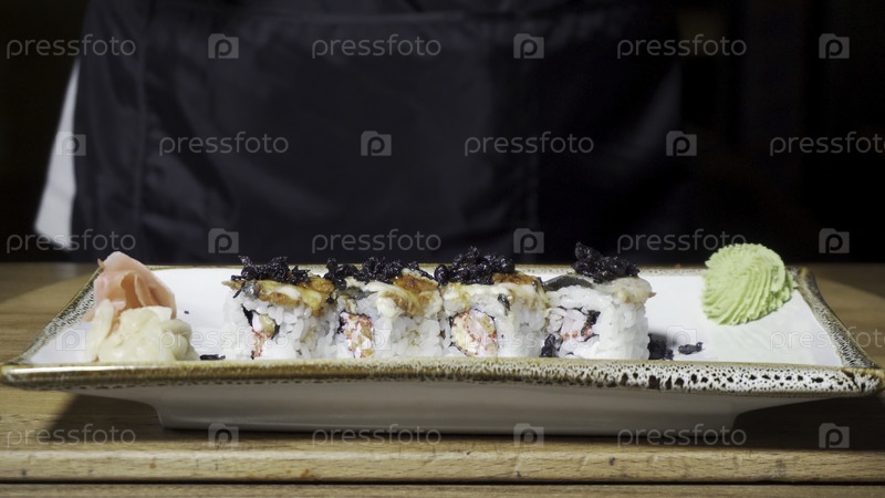 Руки шеф-повара кладут суши на тарелку с приготовленным васаби и имбирем, японская концепция ресторана.Кокаин в перчатках готовится путем размещения вкусных рулонов суши на белом блюде