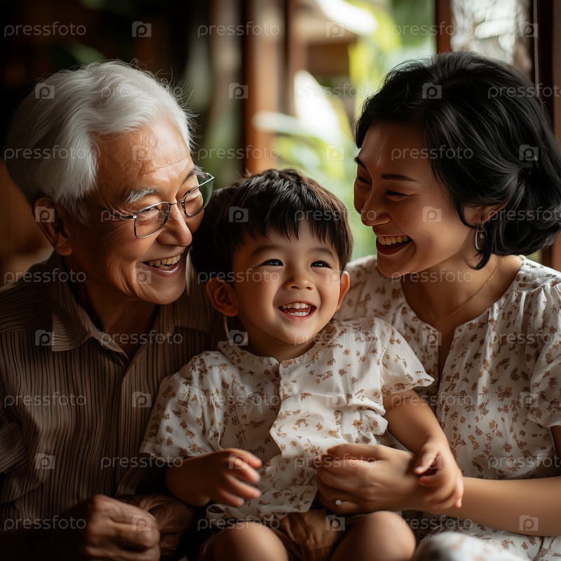 Бабушки и дедушки наслаждаются временем с внуком на закате