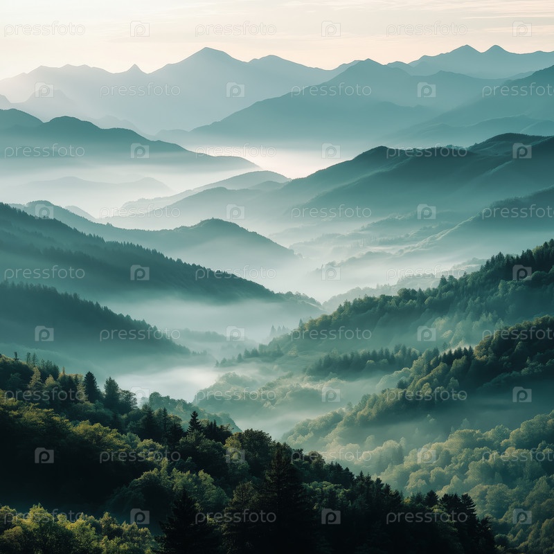 Туманный восход солнца над холмами и лесами