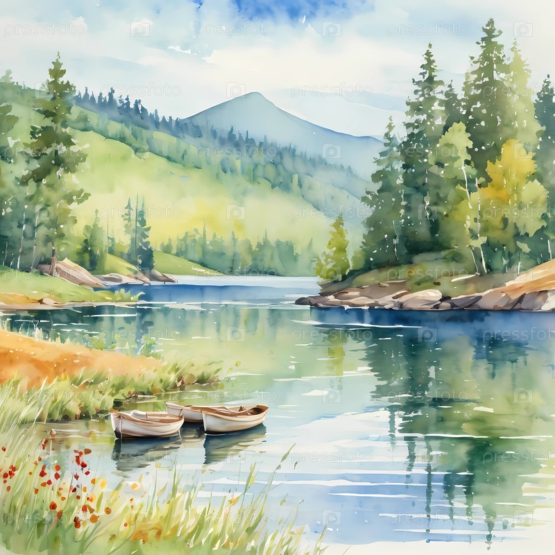 Расположенное в яркой тайге, безмятежное озеро отражает пышную зелень вокруг него, а далекие горы возвышаются величественно под ясным небом