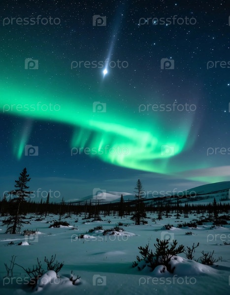 Яркая зелень и северное сияние синий простираются по чистому ночному небу над снежной тундрой, создавая завораживающую новогоднюю атмосферу