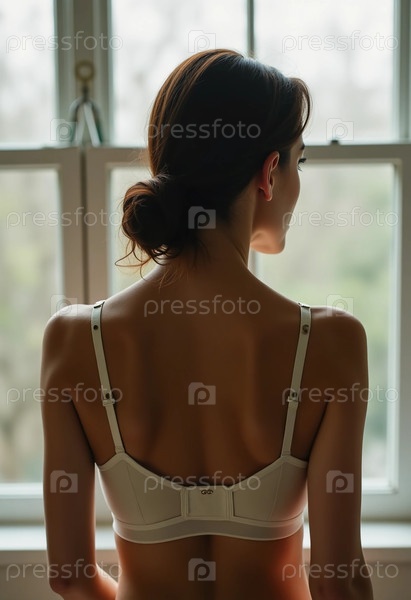 Женщина с повернутым спиной демонстрирует стильный бюстгальтер, подчеркивая деликатные детали.Мягкий естественный свет усиливает очарование этого интимного момента, захваченного в помещении генеративным ИИ