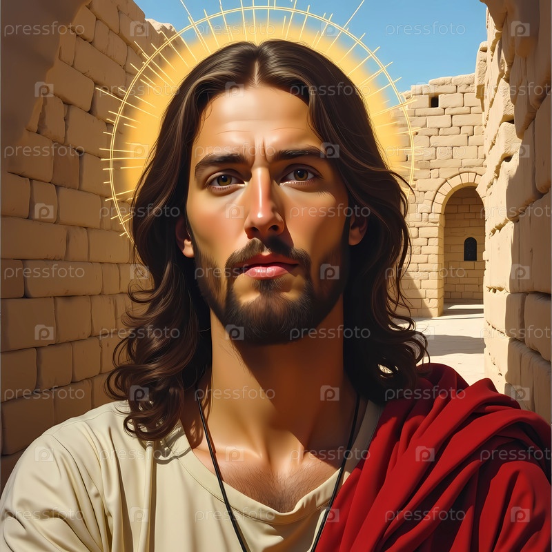 С длинными волосами и нежным взглядом Христос появляется на солнечном дворе, окруженном выветрившимися каменными стенами, символизирующими надежду и божественную любовь в древнем мире