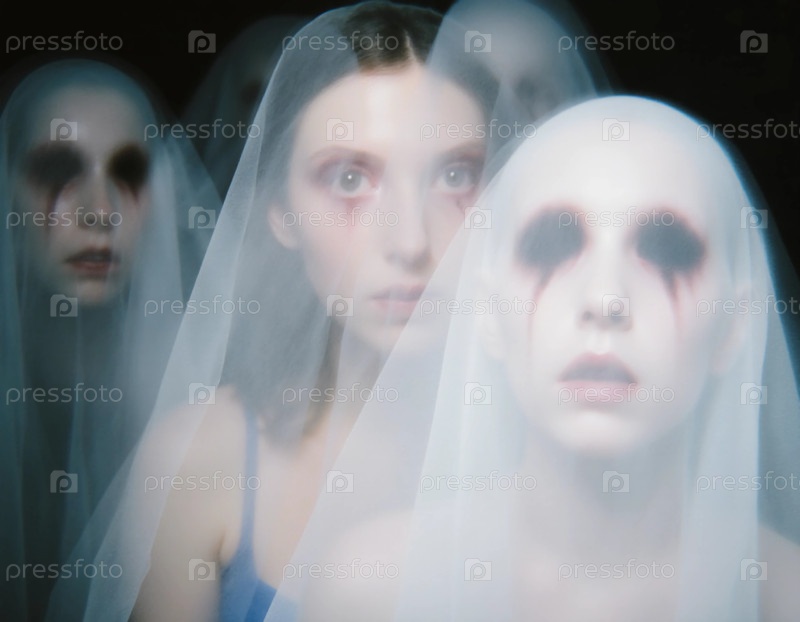 Призрачные фигуры в белых платках с преследующими глазами создают жуткую атмосферу в темном месте, идеально подходящем для Хэллоуина