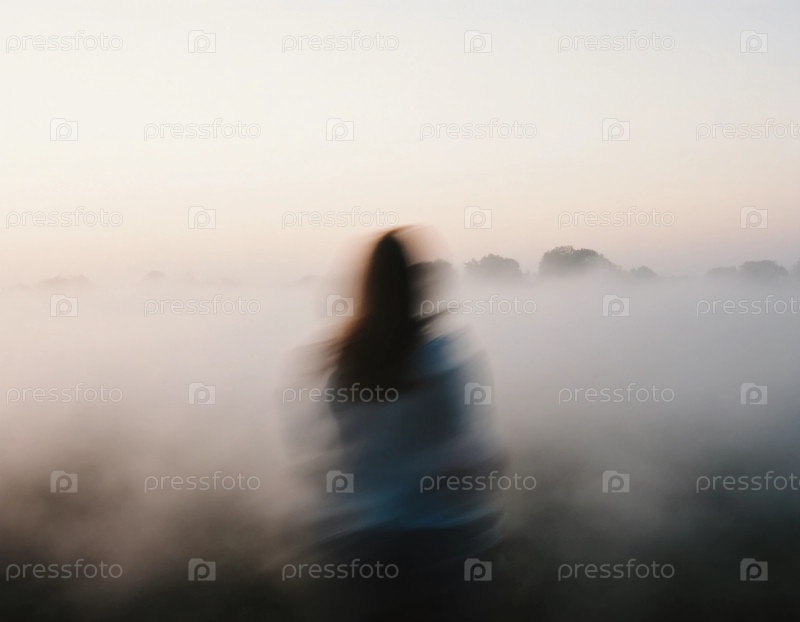 Девчонка стоит на туманном поле рано утром.Дым создает таинственную атмосферу, заставляя ее выглядеть почти как призрак против мягкого света