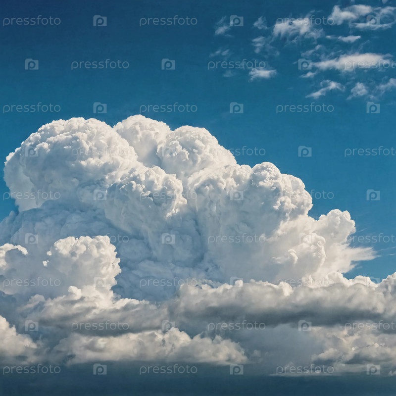 Величественные облака белого и серого цвета контрастируют с глубоким голубым небом, когда заходит солнце, бросая теплый свет над пейзажем