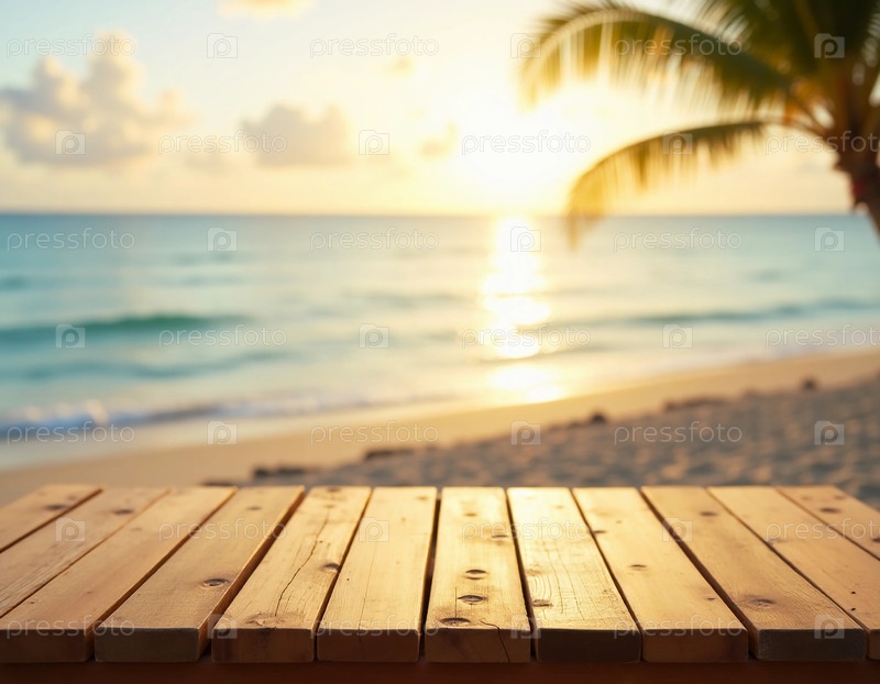 Деревянный стол опирается на золотистый песок, когда солнце садится над океаном, бросая теплое свечение на тихий пляж, приглашая к релаксации и размышлениям