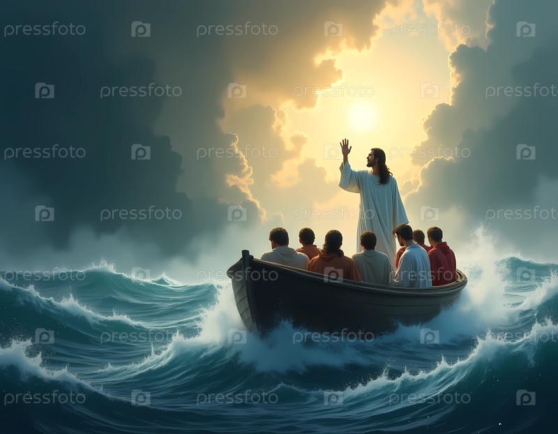 В бурных водах неподвижная лодка несет Иисуса и его последователей. с поднятыми руками он успокаивает хаос, окружающий их под ярким небом