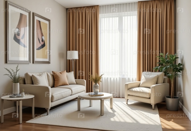 Уютная жилая комната может похвастаться современным дизайном с нейтральными тонами, большими окнами, вкусными произведениями искусства и плюшевыми сиденьями, которые идеально подходят для отдыха и собрания