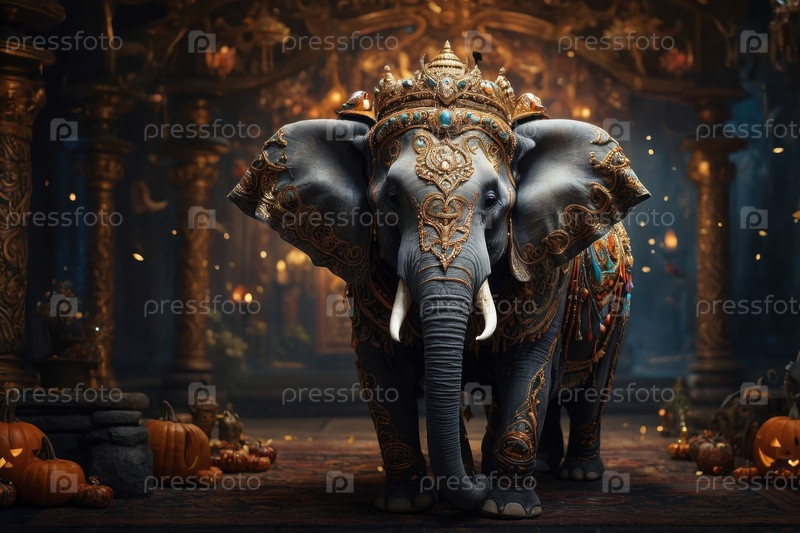 ИИ-генерирующее слоновое животное на темном пугающем фоне тыквы с украшением Хэллоуина