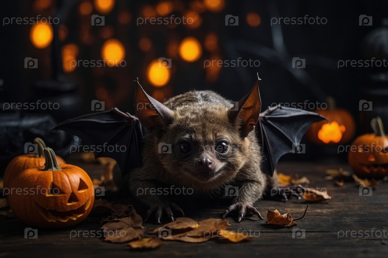 Генерирующая черная летучая мышь раскрывает крылья на темном страшном фоне Хэллоуина