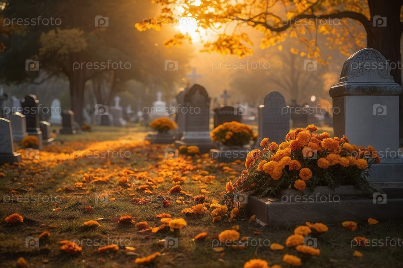 Оранжевые цветы Дня мертвых на кладбище в день его смерти
