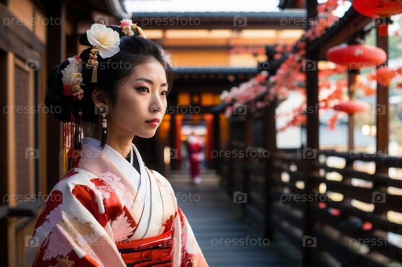 Генеративная женщина в традиционном японском кимоно на фоне архитектуры, открытка ко Дню японской культуры