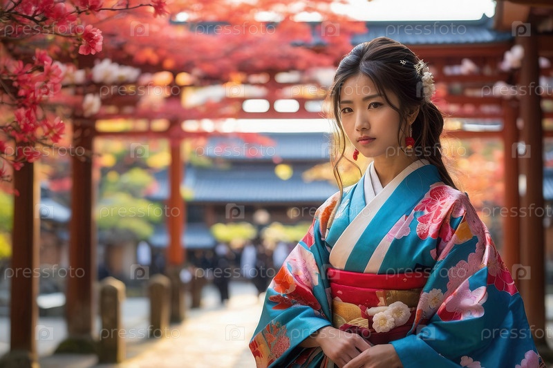 Генеративная женщина в традиционном японском кимоно на фоне архитектуры, открытка ко Дню японской культуры