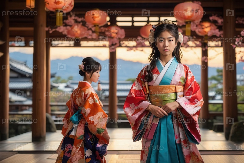 Генеративная женщина в традиционном японском кимоно на фоне архитектуры, открытка ко Дню японской культуры